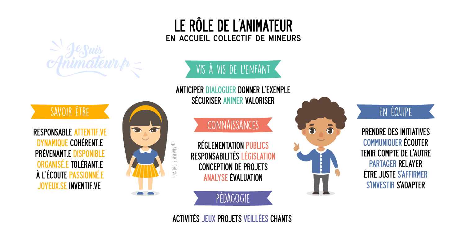 L’animateur.trice participe au sein d’une équipe à la mise en place du projet pédagogique conduit par le directeur / la directrice, en cohérence avec le projet éducatif de l’organisateur du séjour.