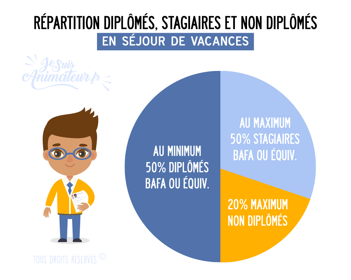 - Le nombre de « stagiaires » - personnes qui effectuent un stage pratique dans le cadre de la préparation du BAFA ou de l’un des autres diplômes ou titres permettant d’exercer les fonctions d'animation - varie en fonction des deux précédents impératifs et ne peut donc être supérieur à 50% de l’effectif d’animateurs requis au total.